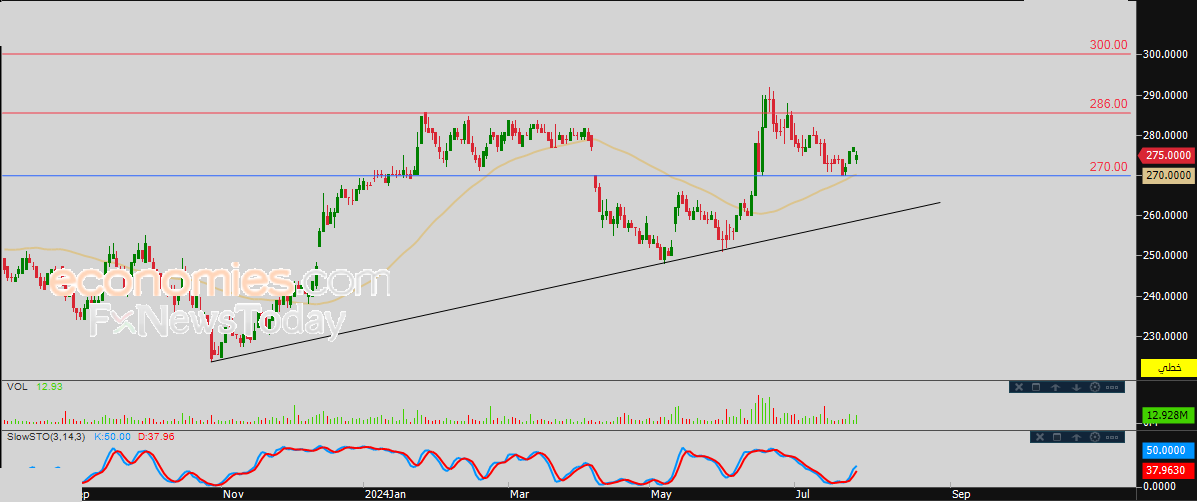 لهذا فتوقعاتنا ترجح عودة صعود سعر السهم خلال تداولاته القادمة، طيلة ثبات مستوى الدعم 270.00، ليستهدف من جديد مستوى المقاومة المحوري والعنيد 286.00.