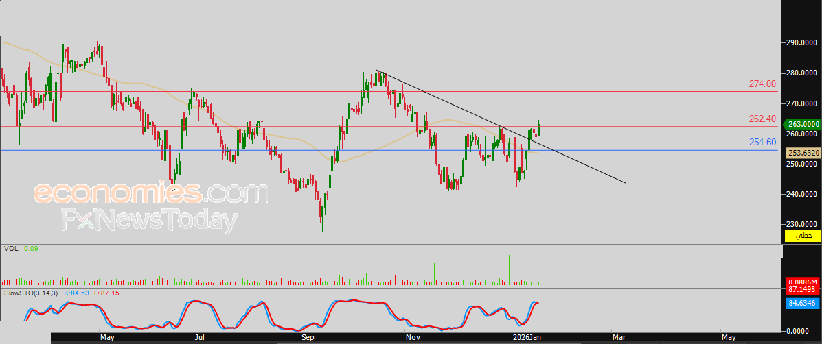 لهذا فتوقعاتنا تشير إلى صعود سعر السهم خلال تداولاته القادمة، خاصة في حالة اختراقه للمقاومة المذكورة 262.40 ريال، ليستهدف بعدها أولى مستويات المقاومة عند سعر 274.00 ريال.