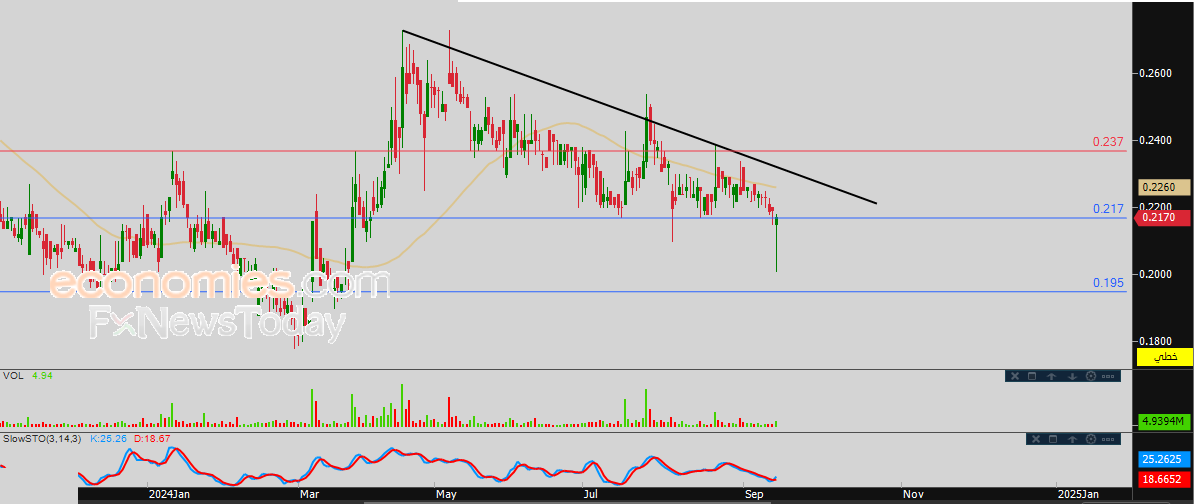 لذلك نحن نتوقع انخفاض سعر السهم خلال تداولاته القادمة، خاصة في حالة كسره للدعم 0.217، ليستهدف بعدها مستوى الدعم 0.195.