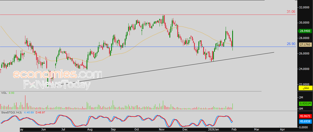 لهذا تشير توقعاتنا إلى صعود سعر السهم خلال تداولاته القادمة، طيلة ثبات مستوى الدعم 26.90 ريال، ليستهدف مستوى المقاومة المحوري 31.00 ريال.