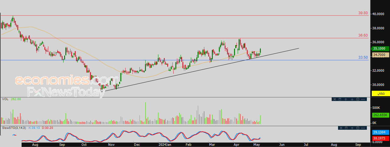 لذلك نحن نتوقع المزيد من الصعود لسعر السهم خلال تداولاته القادمة، طيلة ثبات الدعم 33.50، ليستهدف أولى مستويات المقاومة عند سعر 36.60 ريال.