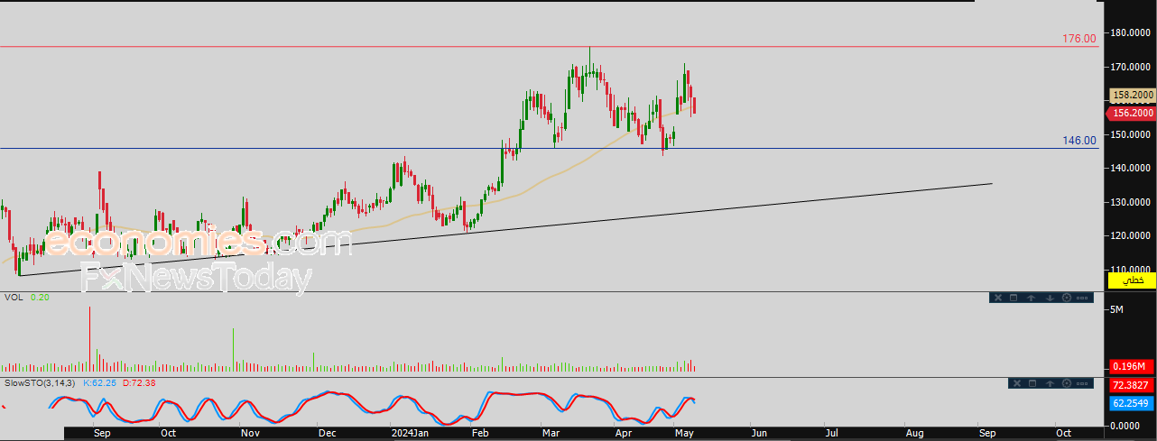 لهذا نحن نرجح عودة صعود سعر السهم خلال تداولاته القادمة، طيلة ثبات مستوى الدعم 146.00، ليستهدف مستوى المقاومة المحوري 176.00.