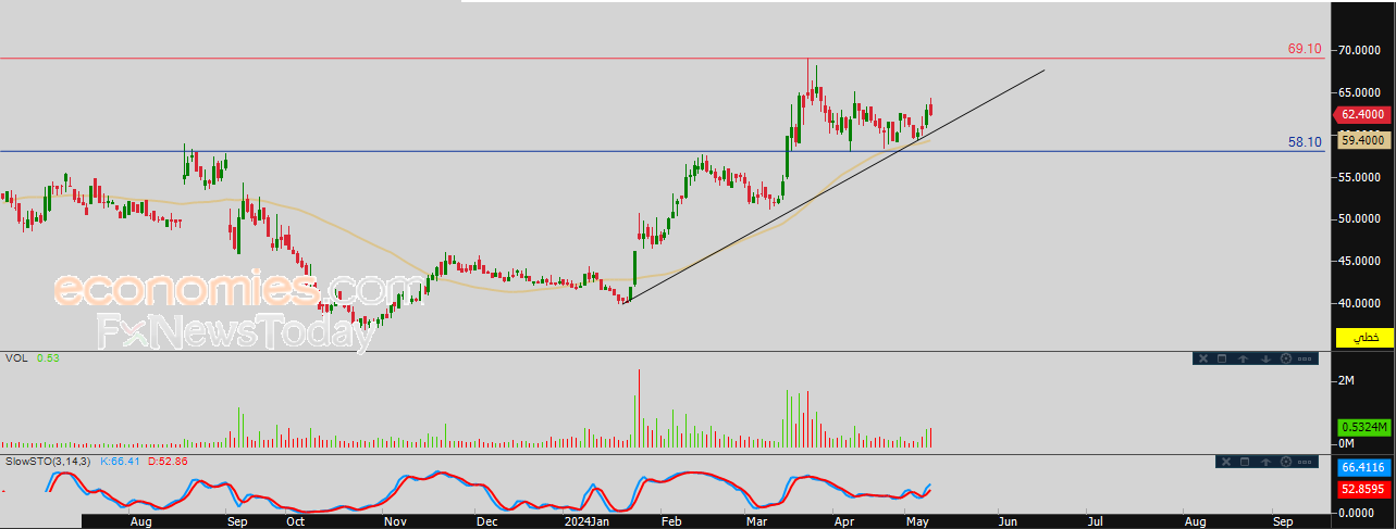 لذلك نحن نرجح عودة صعود سعر السهم خلال تداولاته القادمة، طيلة ثبات الدعم 58.10، ليستهدف مستوى المقاومة المحوري 69.10.