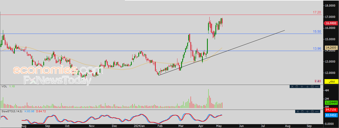 لهذا تشير توقعاتنا إلى ترجيح سيناريو عودة صعود سعر السهم خلال تداولاته القادمة، طيلة ثبات الدعم 15.50، ليستهدف مستوى المقاومة 17.20.