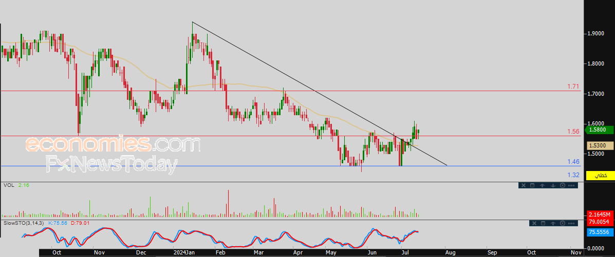 لهذا تشير توقعاتنا إلى المزيد من الصعود لسعر السهم خلال تداولاته القادمة، خاصة طيلة استقراره فوق مستوى 1.56، ليستهدف مستوى المقاومة 1.71.