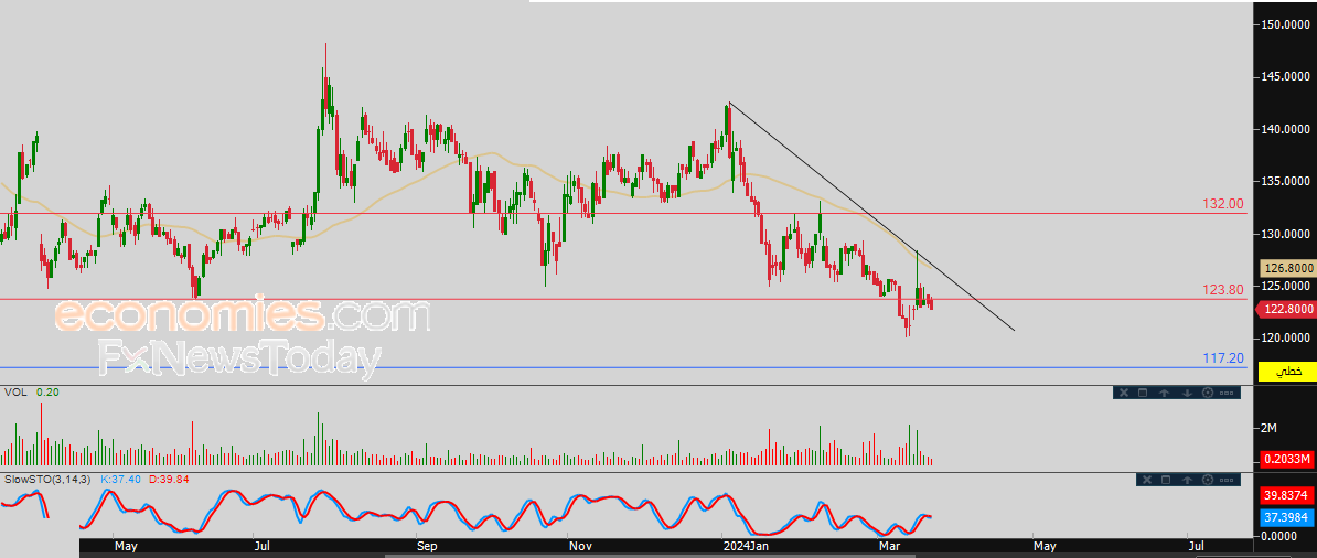 لذلك نحن نتوقع المزيد من الانخفاض للسهم خلال تداولاته القادمة، طيلة ثبات المقاومة 123.80، ليستهدف مستوى الدعم 117.20.