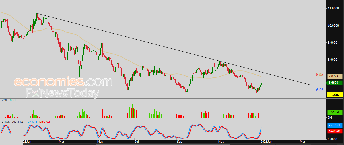 لذلك تميل توقعاتنا نحو هبوط سعر السهم خلال تداولاته القادمة، طيلة ثبات مستوى المقاومة 6.95 ريال، ليستهدف من جديد مستوى الدعم المحوري 6.06 ريال.