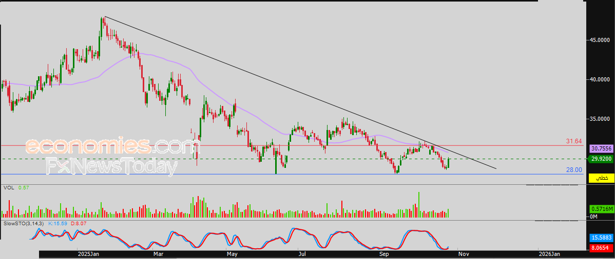 لهذا فطيلة ثبات مستوى المقاومة 31.64 ريال فإن توقعاتنا لسعر السهم تميل نحو الهبوط خلال تداولاته القادمة، ليستهدف مستوى الدعم المحوري 28.00 ريال.