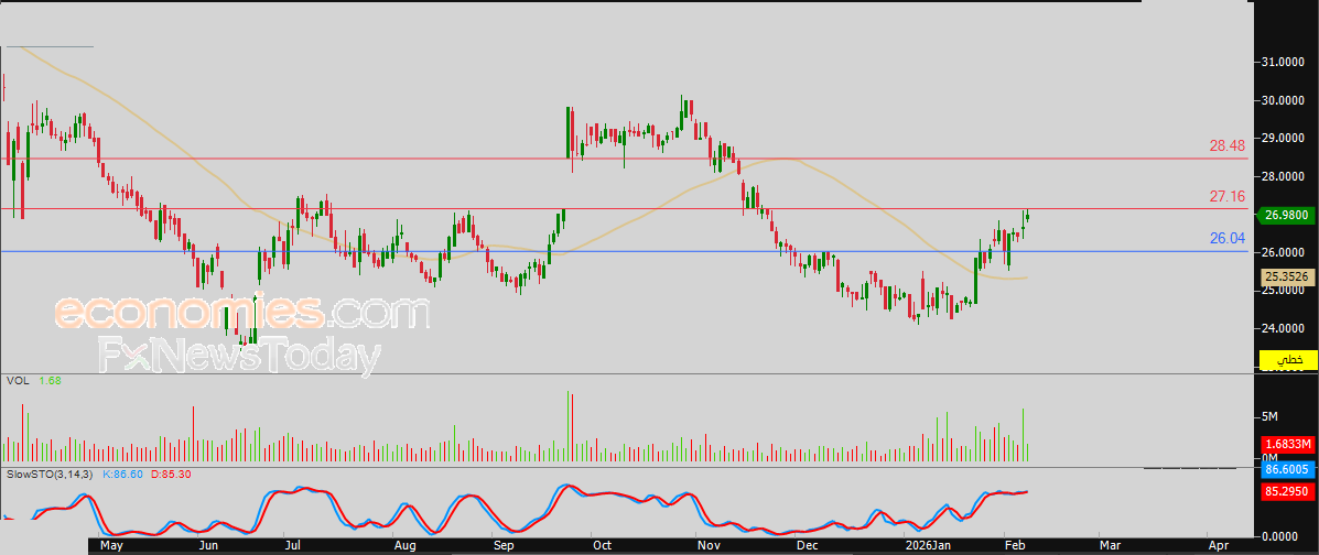 لهذا تشير توقعاتنا إلى صعود سعر السهم خلال تداولاته القادمة، خاصة في حالة اختراقه للمقاومة المذكورة 27.15 ريال، ليستهدف بعدها مقاومته التالية عند سعر 28.50 ريال.