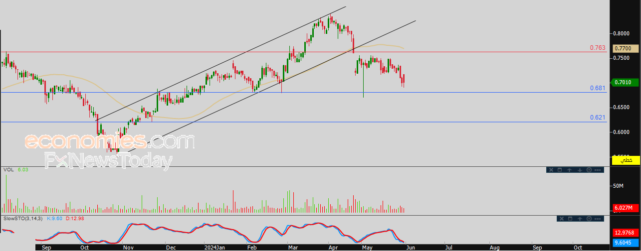 لهذا فتوقعاتنا ترجح عودة هبوط سعر السهم خلال تداولاته القادمة، طيلة ثبات المقاومة 0.763، ليستهدف مستوى الدعم المحوري 0.681 استعداداً لكسره.