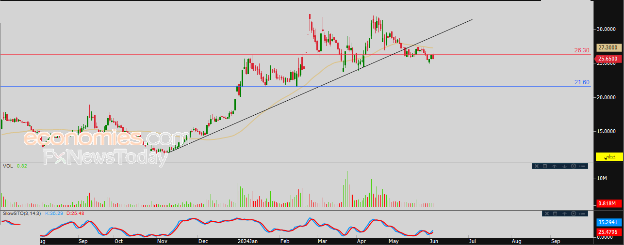 لذلك نحن نتوقع المزيد من الهبوط لسعر السهم خلال تداولاته القادمة، طيلة ثبات المقاومة 26.30، ليستهدف مستوى الدعم 21.60.