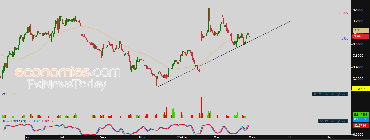 لهذا تشير توقعاتنا إلى ترجيح سيناريو عودة ارتفاع سعر السهم خلال تداولاته القادمة، بشرط يظل مستقراً فوق مستوى 3.85، ليستهدف مستوى المقاومة المحوري 4.300.