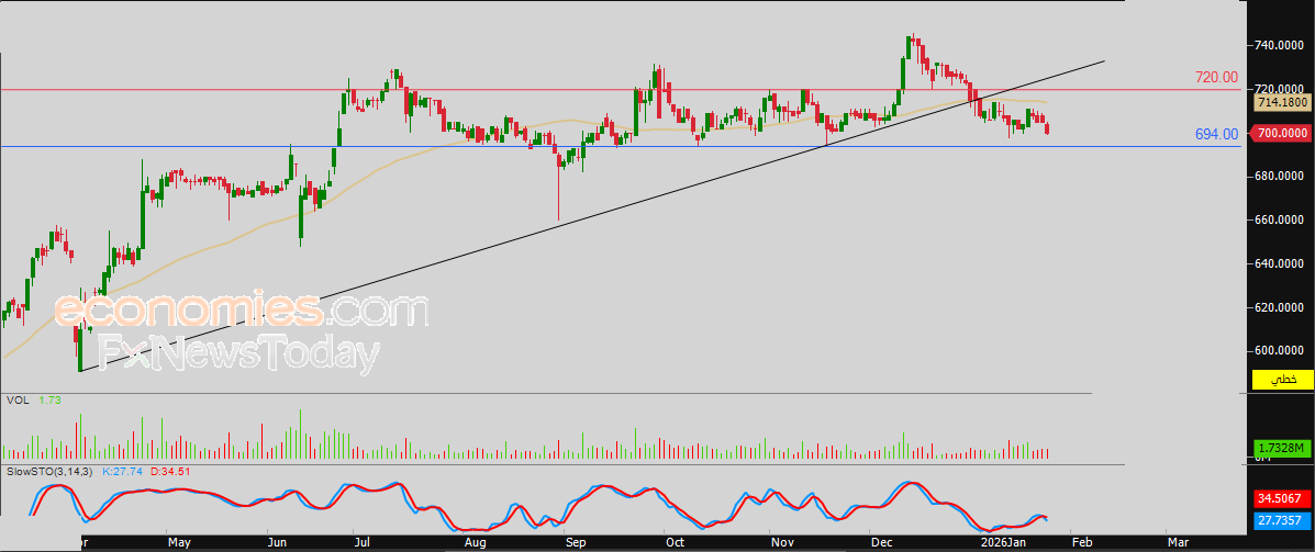 لذلك تشير توقعاتنا إلى انخفاض سعر السهم خلال تداولاته القادمة، طيلة ثبات مستوى المقاومة 720.00 دينار، ليستهدف مستوى الدعم المحوري والقريب 694.00 دينار، مع وجود فرص قوية لكسره.