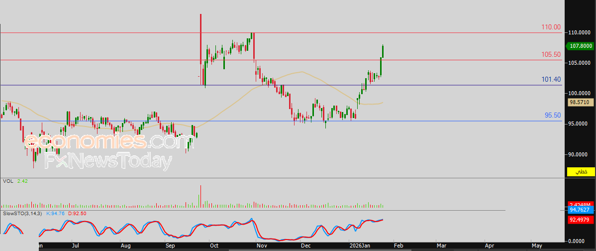 لذلك فتوقعاتنا تشير إلى صعود سعر السهم خلال تداولاته القادمة، خاصة طيلة استقراره أعلى سعر 105.50 ريال، ليستهدف مستوى المقاومة المحوري 110.00 ريال.