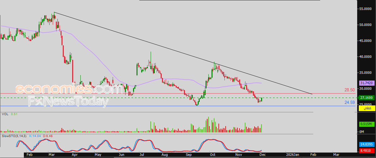 لهذا تشير توقعاتنا إلى انخفاض سعر السهم خلال تداولاته القادمة، خاصة طيلة استقراره دون مستوى المقاومة 28.50 ريال، ليستهدف مستوى الدعم المحوري 24.60 ريال.