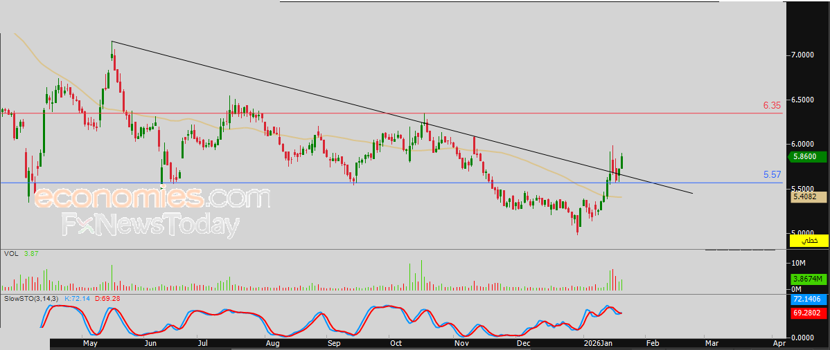 لذلك فتوقعاتنا تشير إلى صعود سعر السهم خلال تداولاته القادمة، طيلة ثبات مستوى الدعم 5.57 ريال، ليستهدف مستوى المقاومة المحوري 6.35 ريال.