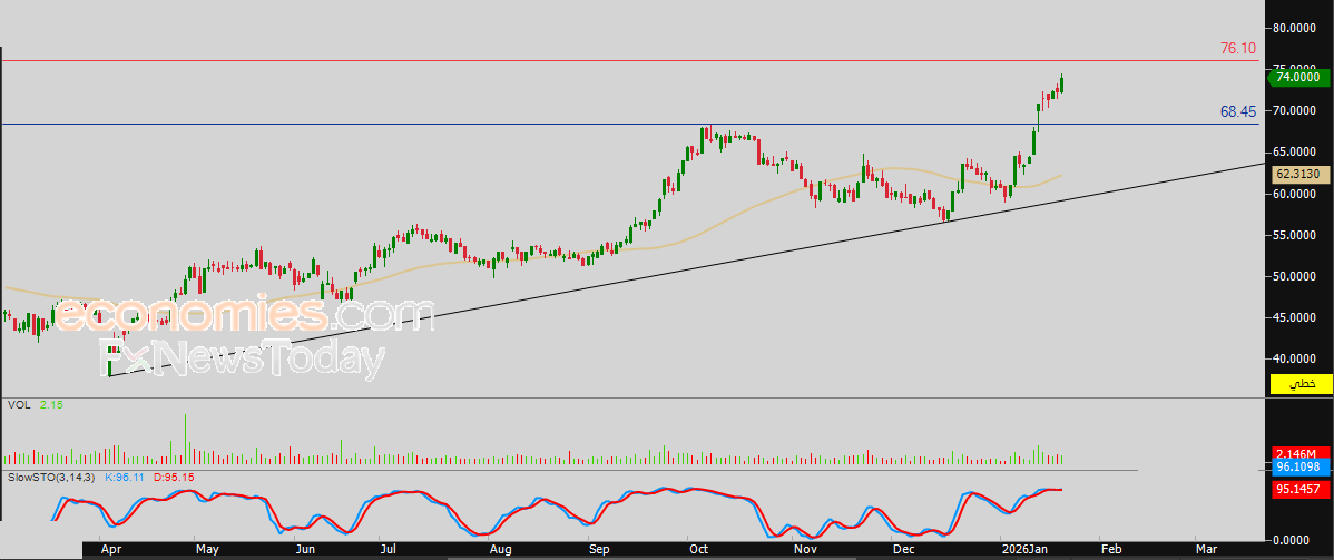 لهذا تشير توقعاتنا إلى صعود سعر السهم خلال تداولاته القادمة، طيلة ثبات مستوى الدعم 68.45 ريال، ليستهدف أولى مستويات المقاومة عند سعر 76.00 ريال.