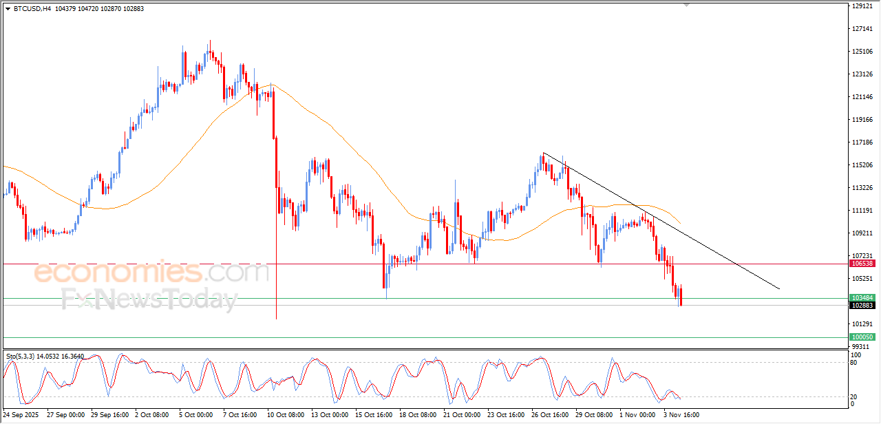 عمق سعر البتكوين (BTCUSD) من خسائره خلال تداولاته اللحظية الأخيرة، ليكسر السعر مستوى الدعم المهم 103,500$، وسط توارد الإشارات السلبية بمؤشرات القوة النسبية، بعدما نجح السعر بتحركاته السابقة في تصريف تشبعه البيعي بها، ما يضاعف من الضغوط السلبية المحيطة به، في ظل سيطرة الاتجاه الرئيسي الهابط وتداولاته بمحاذاة خط ميل فرعي على المدى القصير.