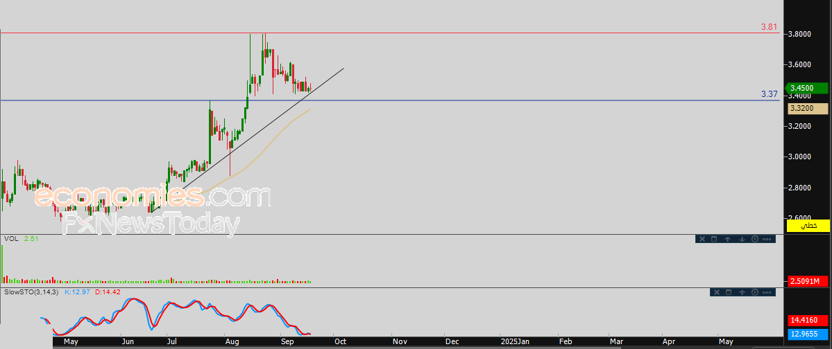 لهذا تشير توقعاتنا إلى ارتفاع سعر السهم خلال تداولاته القادمة، طيلة ثبات مستوى الدعم 3.37، ليستهدف مستوى المقاومة المحوري 3.81.