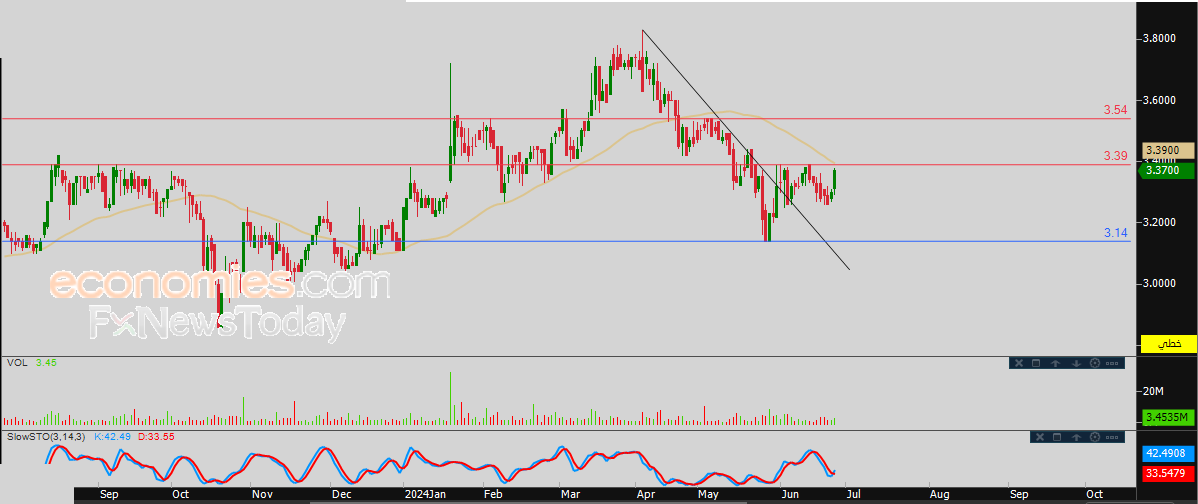 لذلك نحن نتوقع المزيد من الصعود لسعر السهم خلال تداولاته القادمة، خاصة في حالة اختراقه للمقاومة 3.40، ليستهدف بعدها أولى مستويات المقاومة عند سعر 3.55.