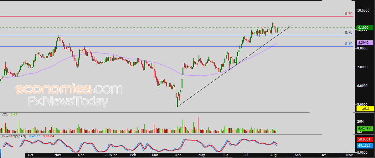 لذلك فتوقعاتنا تشير إلى صعود سعر السهم خلال تداولاته القادمة، طيلة ثبات الدعم 8.70 ريال، ليستهدف مستوى المقاومة 9.70 ريال.