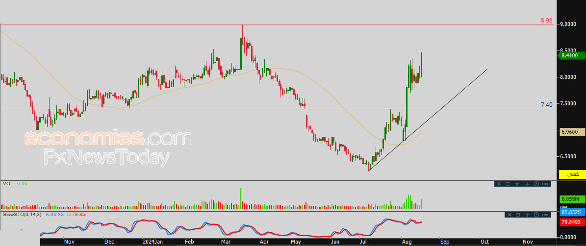 لذلك نحن نتوقع المزيد من الصعود لسعر السهم خلال تداولاته القادمة، طيلة ثبات مستوى الدعم 7.40، ليستهدف مستوى المقاومة المحوري 9.00.