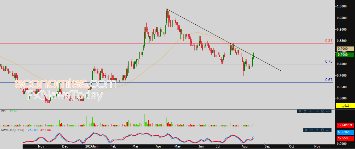 لذلك فتوقعاتنا ترجح المزيد من الصعود لسعر السهم خلال تداولاته القادمة، بشرط استقراره أعلى مستوى الدعم 0.75، ليستهدف مستوى المقاومة المهم 0.85 استعداداً لمهاجمته.