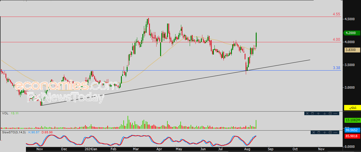 لهذا نحن نتوقع المزيد من الصعود لسعر السهم خلال تداولاته القادمة، خاصة طيلة استقراره فوق مستوى 4.00، ليستهدف مستوى المقاومة المحوري 4.55.