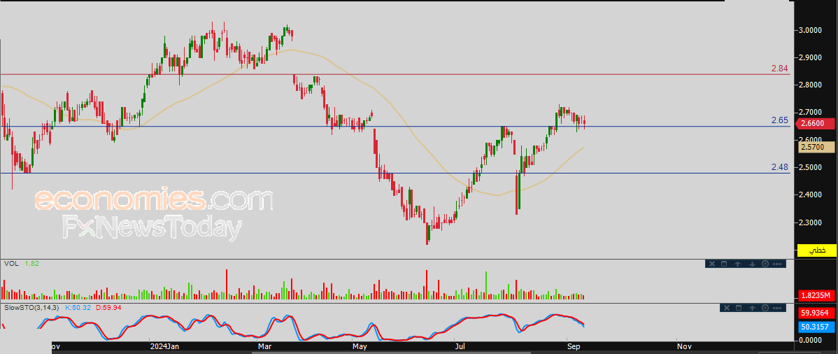 لهذا تشير توقعاتنا إلى ترجيح سيناريو عودة صعود سعر السهم خلال تداولاته القادمة، طيلة استقراره أعلى مستوى 2.65، ليستهدف مستوى المقاومة 2.84.