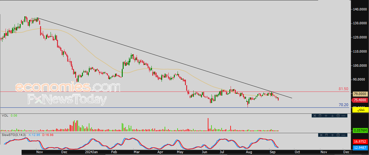 لذلك فتوقعاتنا تشير إلى المزيد من الهبوط لسعر السهم خلال تداولاته القادمة، طيلة ثبات مستوى المقاومة 81.50، ليستهدف مستوى الدعم المحوري 70.20.