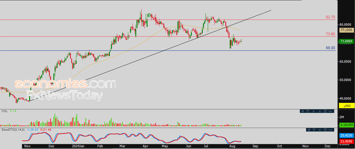 لذلك فتوقعاتنا ترجح عودة هبوط سعر السهم خلال تداولاته القادمة، طيلة استقراره دون مستوى المقاومة 73.60، ليستهدف مستوى الدعم 66.00.