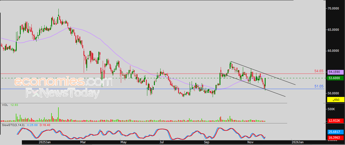 لهذا تميل توقعاتنا إلى عودة انخفاض سعر السهم خلال تداولاته القادمة، طيلة ثبات مستوى المقاومة 54.65 ريال، ليستهدف من جديد مستوى الدعم 51.00 ريال.