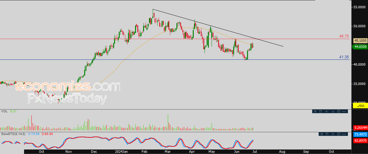 لذلك نحن نرجح عودة هبوط سعر السهم خلال تداولاته القادمة، طيلة ثبات مستوى المقاومة 46.75، ليستهدف مستوى الدعم المهم 41.35.