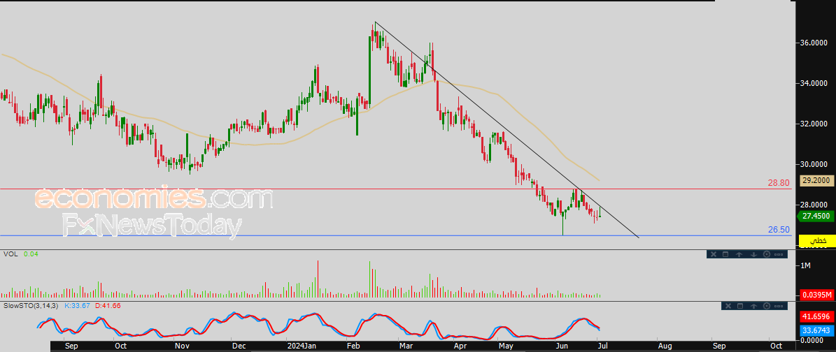 لذلك نحن نرجح عودة هبوط سعر السهم خلال تداولاته القادمة، طيلة ثبات مستوى المقاومة 28.80، ليستهدف مستوى الدعم المهم 26.50.