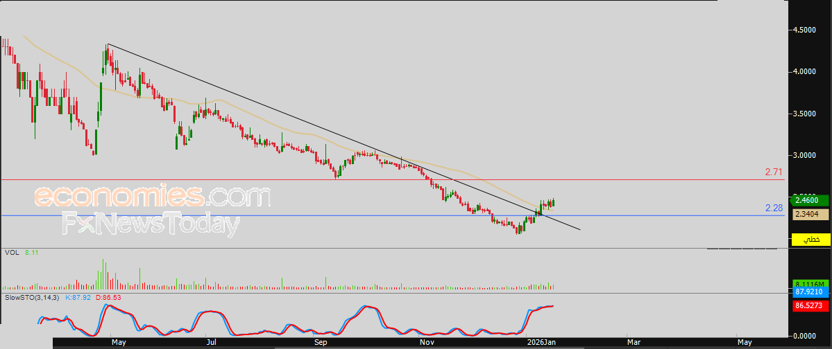لذلك فتوقعاتنا تشير إلى صعود سعر السهم خلال تداولاته القادمة، طيلة استقراره اعلى سعر 2.28 ريال، ليستهدف مستوى المقاومة 2.71 ريال.