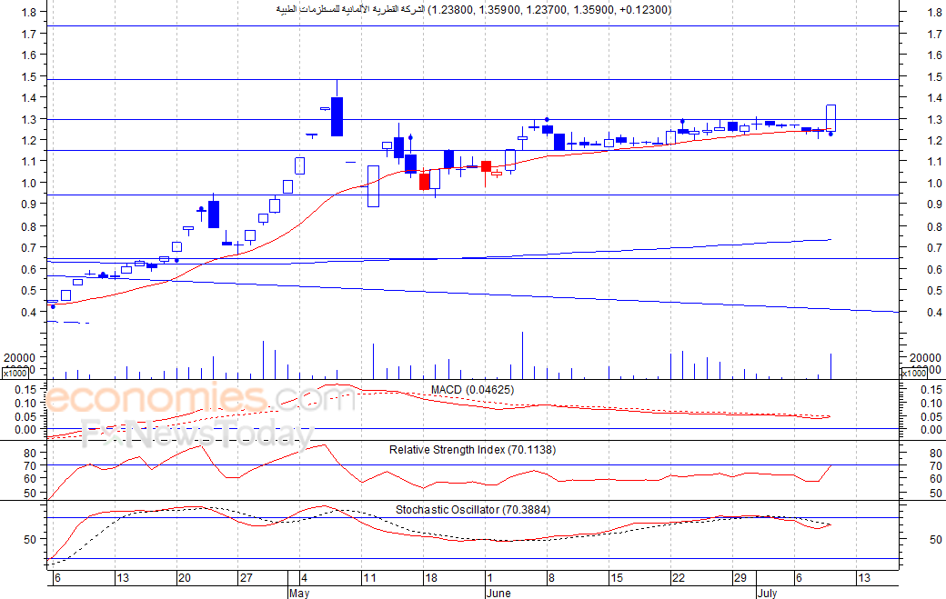 استعاد السهم اتجاهه الصاعد على المدى القصير، حيث اغلق الخميس الماضي عند مستوى 1٫359 ريال، مصحوبا بارتفاع ضخم في كمية التداول، وهو ما يعد إشارة ايجابية، كما تمكن السهم من تجاوز مستوى مقاومته السابق عند 1٫30 ريال، وهو ما يفتح الباب أمام السهم لمزيد من الارتفاع لمستويات قد تصل الى 1٫50 ريال كمستوى أول ثم 1٫75 ريال كمستوى ثان، شرط عدم اختراق السهم لمستوى 1٫30 ريال.