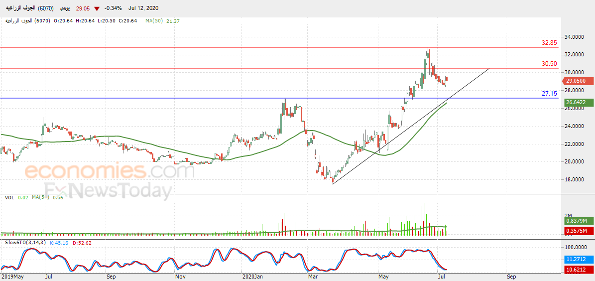 بعد تسجيل سهم الجوف الزراعية (6070) لأعلى سعر له في آخر جلساته عند 29.50، ارتد منه انخفاضاً ليحول مكاسبه تلك إلى خسائر في نهاية التداولات بنسبة بلغت -0.34% بما يعادل -0.10 نقطة، وذلك وسط محاولات السهم المستمرة البحث عن قاع صاعد يتخذ منه قاعدة قد تساعده على الارتفاع من جديد، في ظل تداولاته بمحاذاة خط ميل رئيسي صاعد على المدى القصير، وبدعم إيجابي لتداولاته أعلى متوسطه المتحرك البسيط لفترة 50 يوماً السابقة، مع وصول مؤشرات القوة النسبية لمناطق شديدة التشبع بعمليات البيع، بصورة مبالغ فيها مقارنة بحركة السهم.