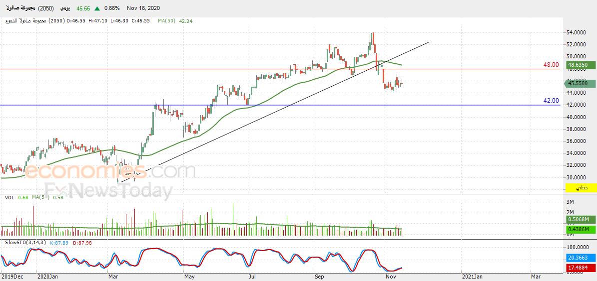 ارتفع قليلاً سهم مجموعة صافولا (2050) في آخر جلساته، ليحاول السهم بهذا الارتفاع تصريف البعض من تشبعه البيعي الواضح بمؤشرات القوة النسبية، خاصة مع بدء توارد الإشارات الإيجابية منها، ليحقق مكاسب طفيفة بلغت نسبتها 0.66% بما يعادل 0.30 نقطة، وذلك في ظل تأثره بكسر خط اتجاه صاعد في وقت سابق، مع استمرار الضغط السلبي لتداولاته دون المتوسط المتحرك البسيط لفترة 50 يوماً السابقة.