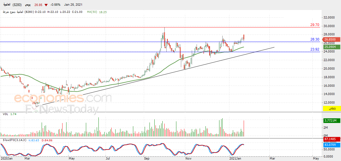 نطاق التداول المتوقع لهذا اليوم ما بين مستوى الدعم 25.65 ومستوى المقاومة 28.50.