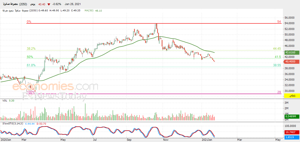 واصل سهم مجموعة صافولا (2050) الانخفاض بتداولاته الأخيرة على المدى القصير، مع استمرار الضغط السلبي لتداولاته دون المتوسط المتحرك البسيط لفترة 50 يوماً السابقة، مع توارد الإشارات السلبية بمؤشرات القوة النسبية، بالرغم من وصولها لمناطق شديدة التشبع بعمليات البيع، ليسجل السهم خسائر جديدة في آخر جلساته بنسبة بلغت -0.62% بما يعادل -0.25 نقطة، كما يستقر السهم دون مستوى المقاومة 41.50، هذا المستوى الذي يمثل نسبة 50% من مستويات فيبوناتشي التصحيحية لآخر موجة صاعدة على المدى القصير (من 29.00 إلى 54.00).
