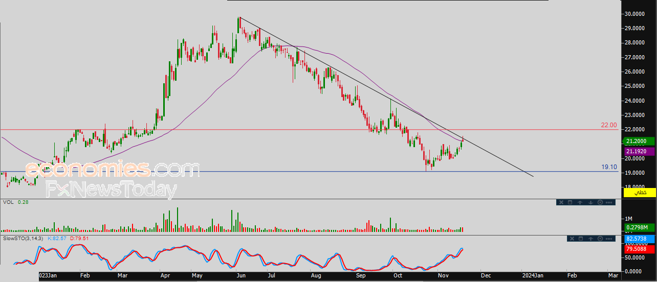 لهذا نحن نرجح عودة انخفاض السهم خلال تداولاته القادمة، طيلة ثبات المقاومة 22.00، ليستهدف من جديد مستوى الدعم 19.10.