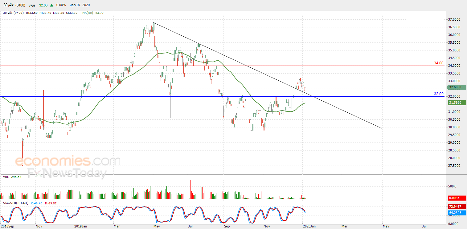 نطاق التداول المتوقع لهذا اليوم ما بين مستوى الدعم 32.00 ومستوى المقاومة 33.20.