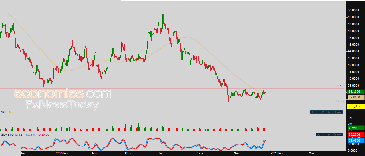 لذلك تشير توقعاتنا إلى ترجيح سيناريو عودة انخفاض السهم خلال تداولاته القادمة، طيلة ثبات المقاومة 38.60، ليستهدف مستوى الدعم المحوري 36.35.