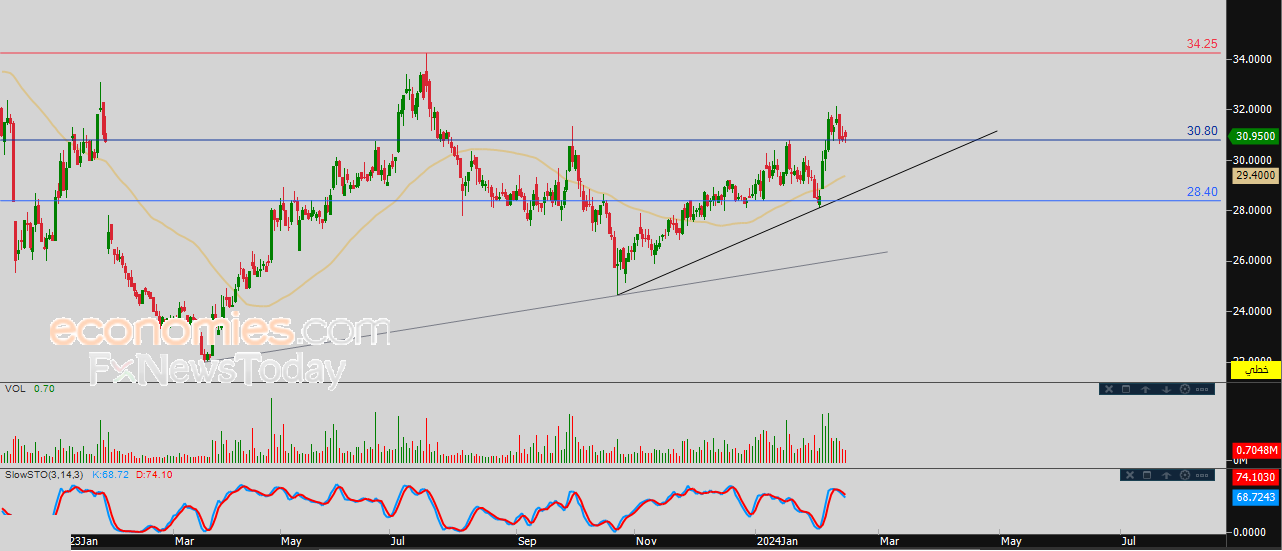لذلك نحن نتوقع ارتفاع السهم خلال تداولاته القادمة، خاصة طيلة استقراره فوق مستوى 30.80، ليستهدف مستوى المقاومة 34.25.