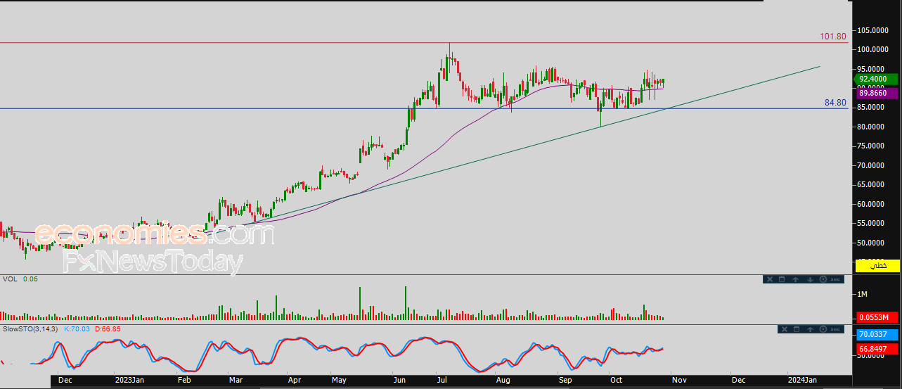 لذلك نحن نتوقع ارتفاع السهم خلال تداولاته القادمة، طيلة ثبات الدعم 84.80، ليستهدف مستوى المقاومة المحوري 101.80.
