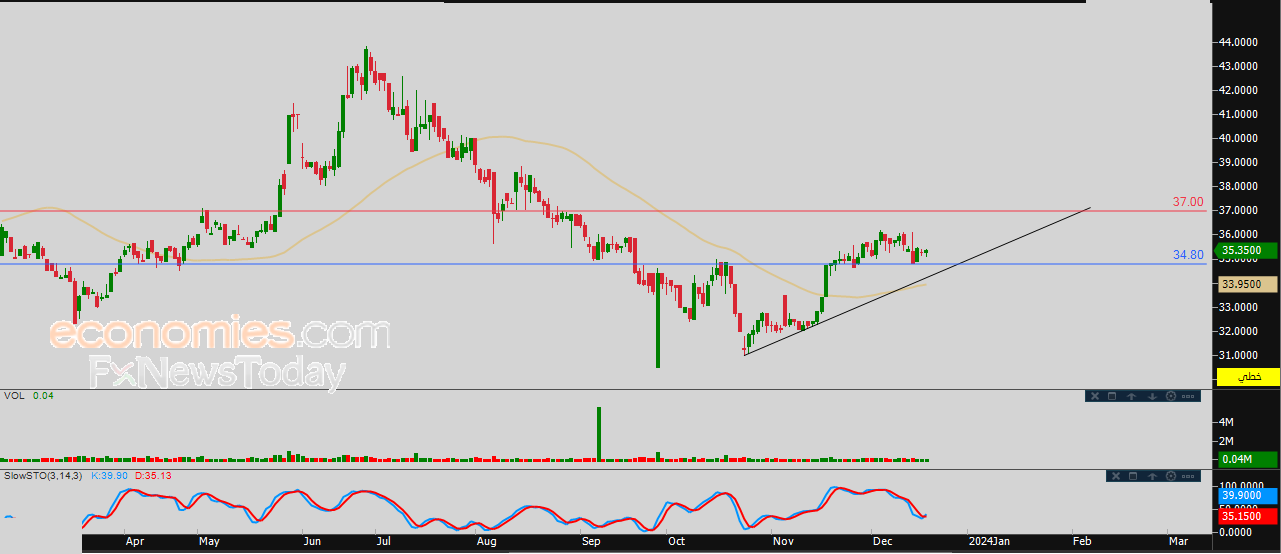 لهذا فتوقعاتنا تشير إلى المزيد من الارتفاع التصحيحي للسهم خلال تداولاته القادمة، طيلة ثبات الدعم 34.80، ليستهدف مستوى المقاومة 37.00.