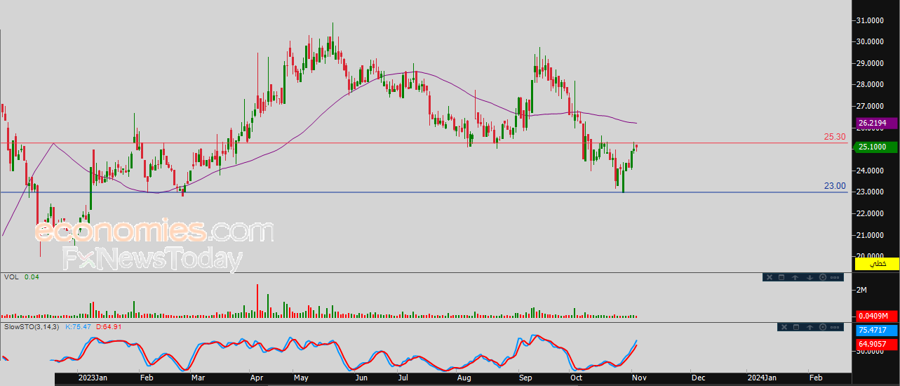 لهذا فتوقعاتنا ترجح عودة انخفاض السهم خلال تداولاته القادمة، بشرط ثبات مستوى المقاومة 25.30، ليستهدف مستوى الدعم المحوري 23.00.