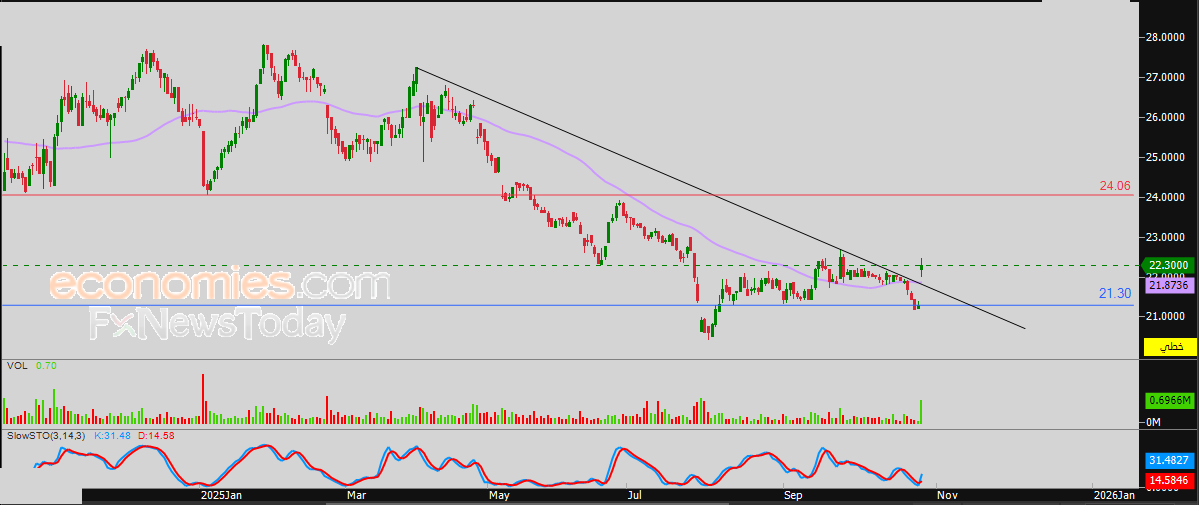 لذلك فتوقعاتنا تشير إلى صعود سعر السهم خلال تداولاته القادمة، طيلة ثبات مستوى الدعم 21.30 ريال، ليستهدف مستوى المقاومة 24.00 ريال.