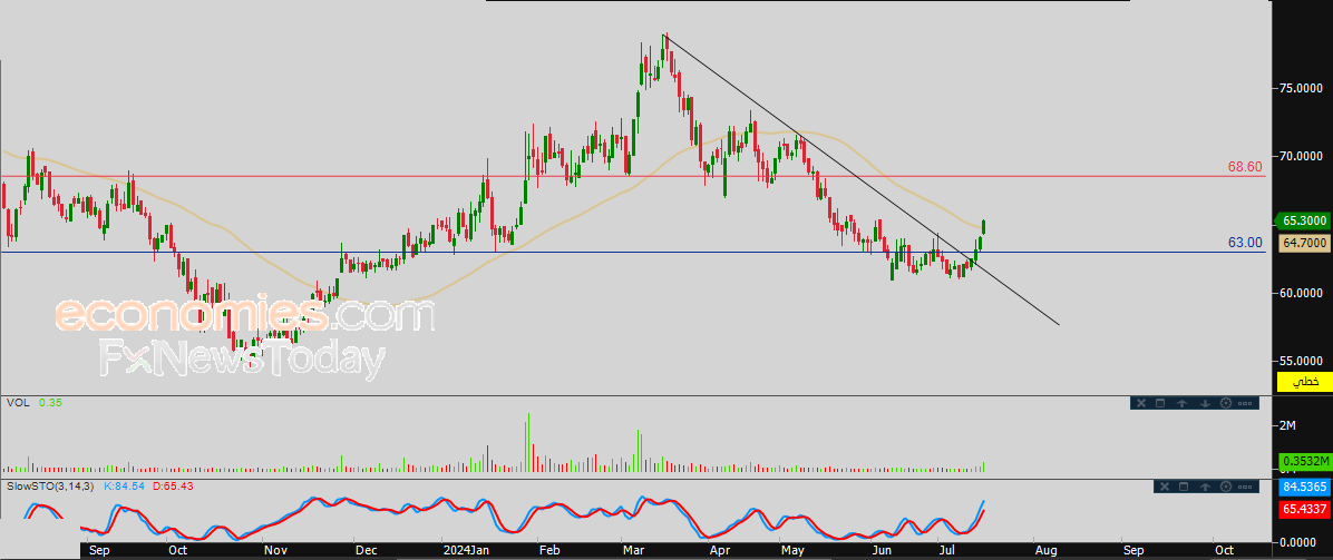 لذلك نحن نتوقع استمرار صعود سعر السهم خلال تداولاته القادمة، طيلة استقراره فوق مستوى 63.00، ليستهدف أولى مستويات المقاومة عند سعر 68.60 ريال.