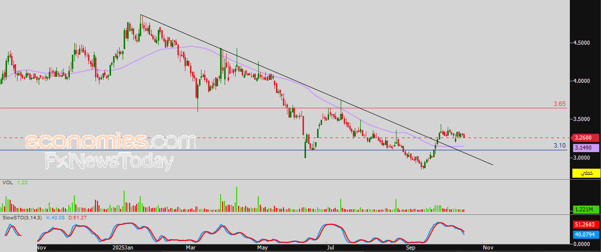 لهذا تشير توقعاتنا إلى صعود سعر السهم خلال تداولاته القادمة، طيلة ثبات مستوى الدعم 3.10 ريال، ليستهدف مستوى المقاومة 3.65 ريال.